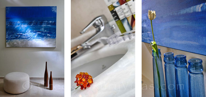 The villas are well designed and furnished with quality and taste. The kitchens are fully equipped, the living-rooms comfortable and with international Sat-TV and DVD, the bedrooms are reasonably spacious, well designed and equipped with TV. The air conditioned bedrooms have their en suite bathrooms with tub/shower, sink and WC. Hairdryers, cosmetic mirrors, bathrobes, bath and beach towels as well as slippers are provided.